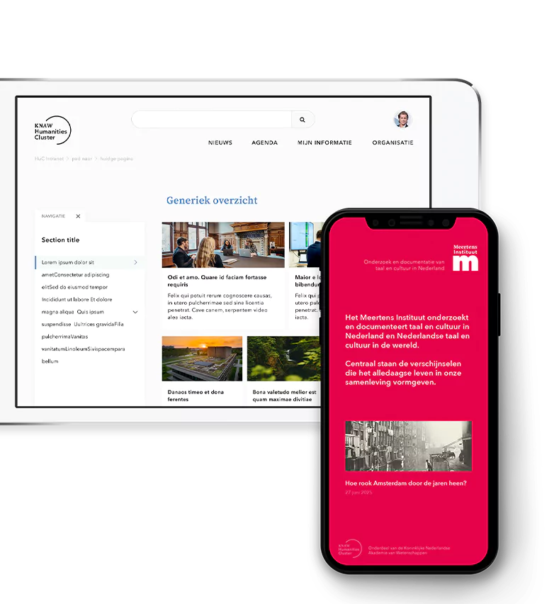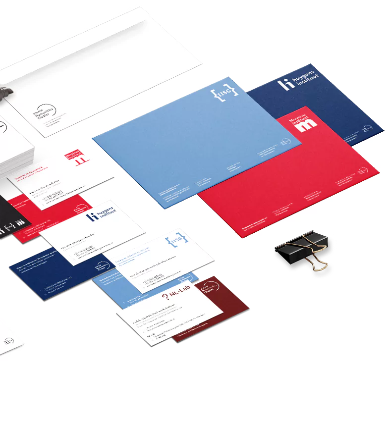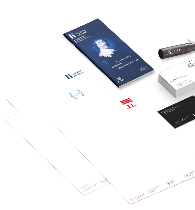 We zorgden ervoor dat het KNAW HuC op alle individuele uitingen – van visitekaartjes tot brochures, van briefpapier tot presentaties – als paraplu zichtbaar was. Met op elkaar afgestemde logo’s, kleuren en lettertypen. Met een onmiskenbare eenheid in stijl en gebruik.